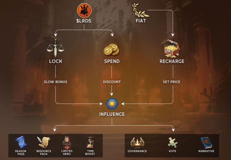 在 BLOCKLORDS 中,玩家通过一系列战略性行为(如资源管理、战斗、统治和质押节点)来赚取 LRDS。代币可用于消费或锁定,以获得“影响力”这一关键资源。影响力可用于购买专属道具、赛季资源包、英雄和时间加速道具。该机制确保玩家的积极参与与明智决策不断获得回报,进一步强化了玩家对游戏经济的所有权。