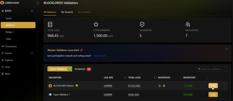 LORDCHAIN 拥有两种类型的验证者:Master Validator 和 User Validators。Master Validator 由 BLOCKLORDS 团队运营,作为主验证节点,保障网络稳定性,并为质押 $LRDS 代币的用户提供质押奖励和治理参与机会。通过在 Master Validator 中锁定 $LRDS,用户将获得 veLRDS(投票权)、游戏内奖励、节点能量(Node Power, NP)以及专属 NFT。