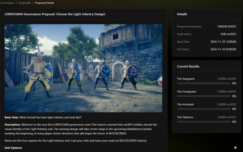 BLOCKLORDS 采用去中心化治理机制,允许玩家就游戏开发、平衡性调整及游戏内政策进行投票。通过锁定 $LRDS 代币,玩家将获得 veLRDS,从而获得治理投票权。