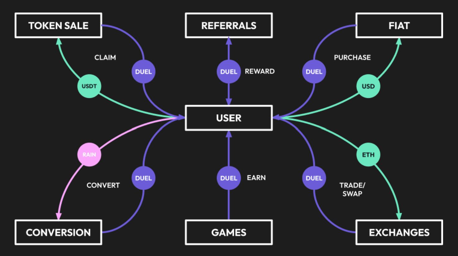 DUEL 旨在激励玩家参与、支持流动性提供者,并促进游戏内购买和治理决策。DUEL 取代了 RAIN 代币,RAIN 持有者可按预定兑换率将其代币转换为 DUEL,并额外获得价值为兑换代币 3 倍的 NFT 奖励。
