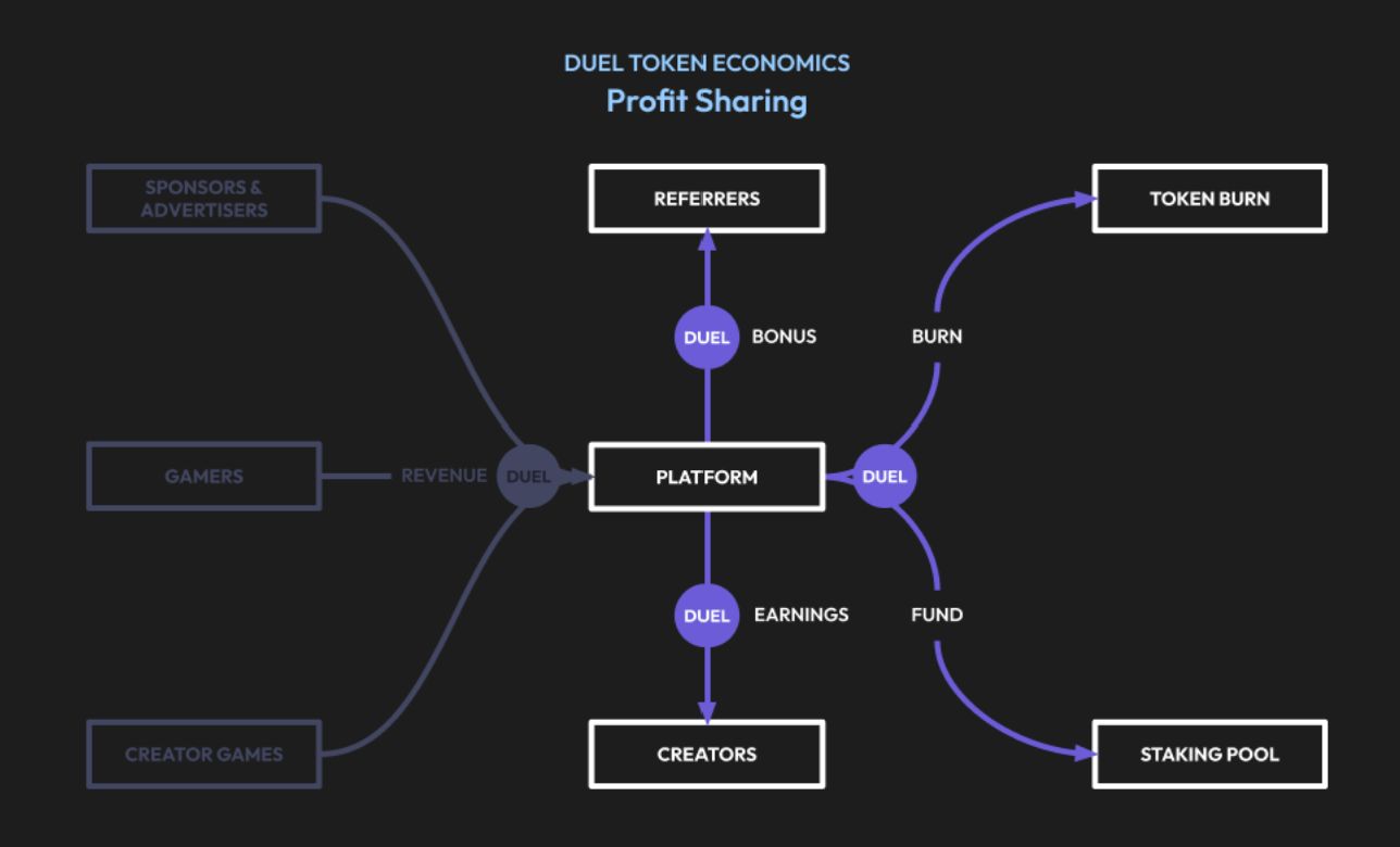 GameGPT 采用代币奖励共享机制,将平台部分利润重新分配给创作者、推荐者和代币持有者。该系统确保社区参与和内容创作具有经济回报,同时通过战略性的代币销毁机制维持 DUEL 代币的通缩模式。
