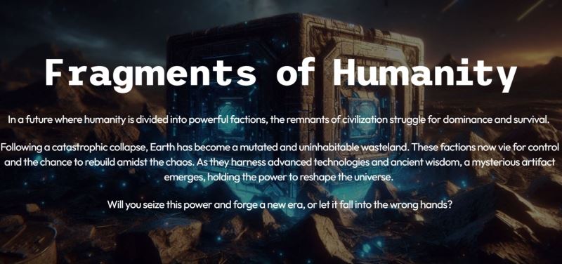 在一场灾难性 事件后,地球变成了一片变异荒地,文明也因此崩溃。玩家通过收集和互动 NFT 英雄角色,影响故事情节的走向和整个生态系统。一个拥有改变宇宙力量的神秘神器推动着冲突,使各派系在战争与团结之间徘徊。