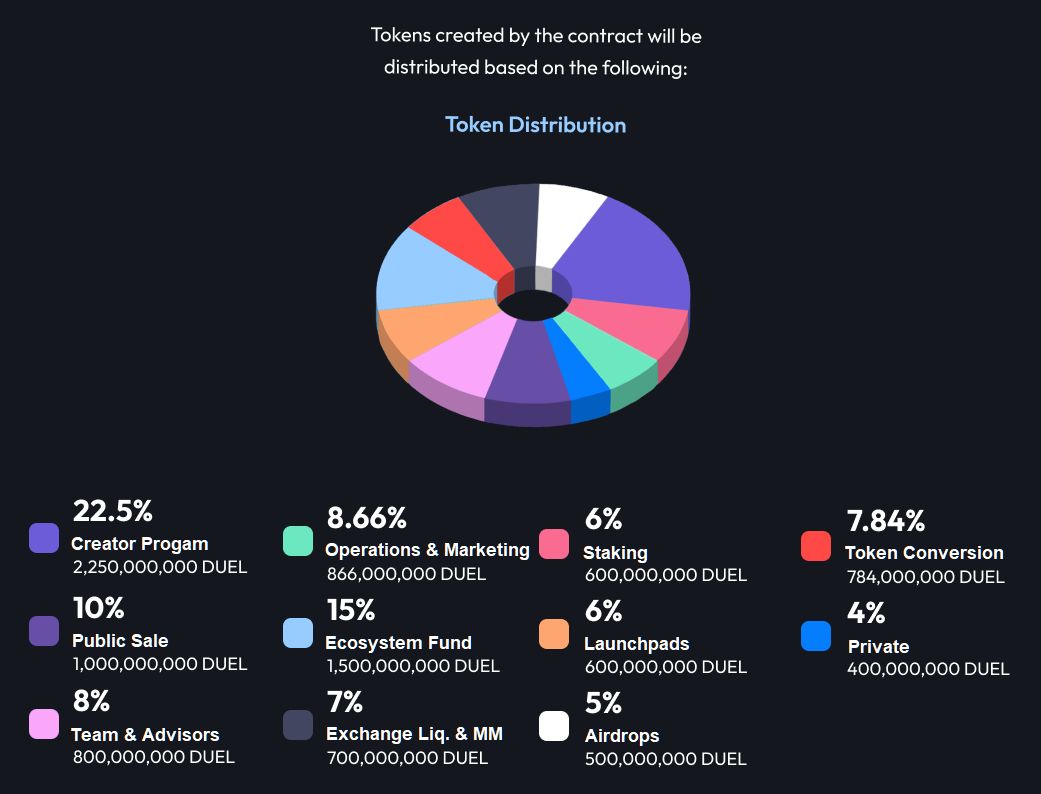 该代币分配模型确保生态系统的平衡与可持续发展, allocations 用于社区增长、生态发展和平台可持续性。其中,22.5% 分配给 Creator Program,15% 分配给生态基金,10% 分配给公开销售,8% 分配给团队和顾问。DUEL 的释放机制采用逐步解锁模式,以确保代币长期稳定性,防止市场抛售。