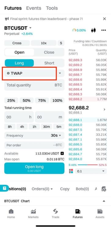 Bitget 让您轻松使用 TWAP 进行期货交易。您可以在手机应用程序或网站上进行设置。
