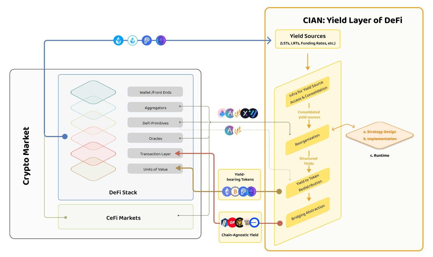 CIAN 收益层的架构包含四个关键模块,涵盖 DeFi 堆栈和传统 CeFi 市场。
