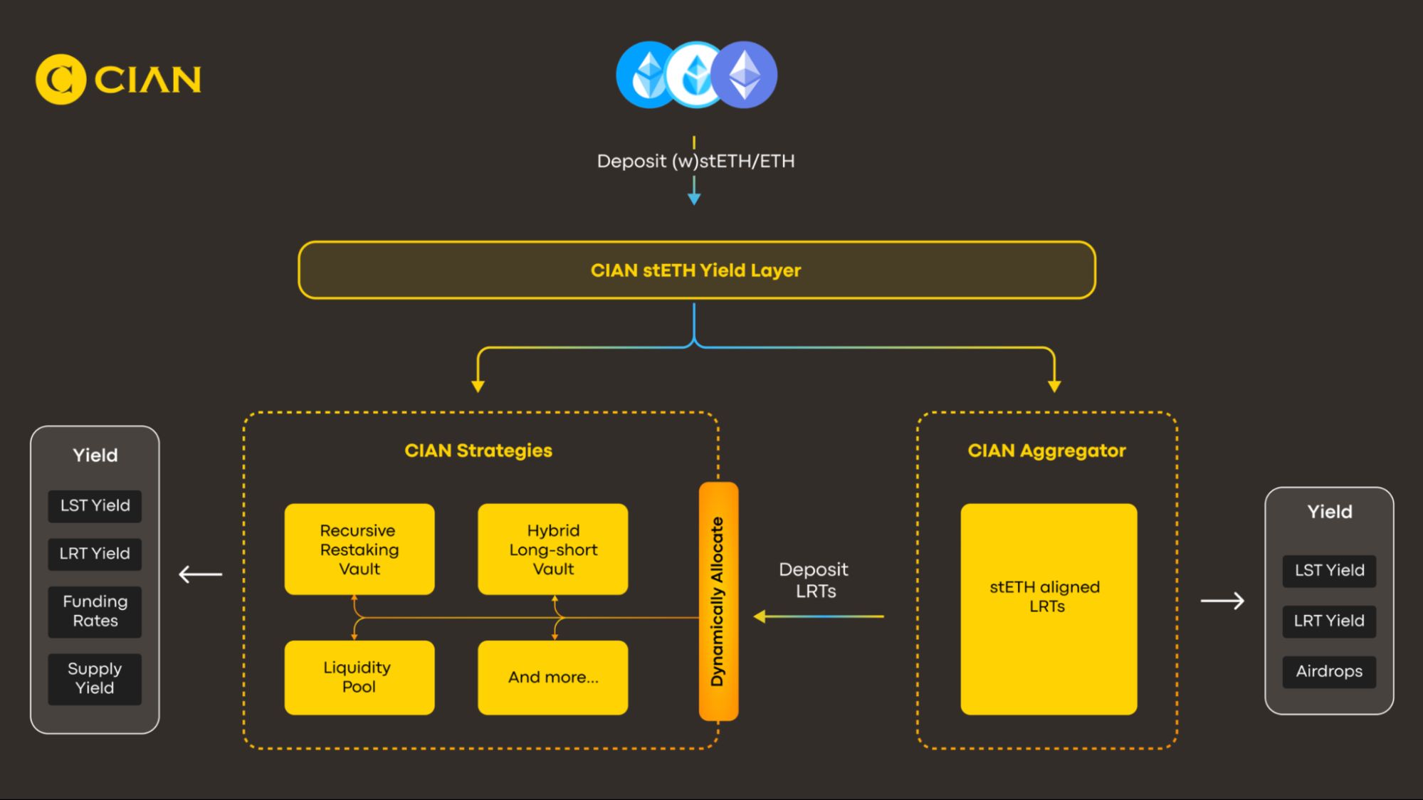 - 利用 CIAN 的先进收益策略,围绕 stETH 和 stETH LRTs 优化 ETH/stETH 持有者的收益。