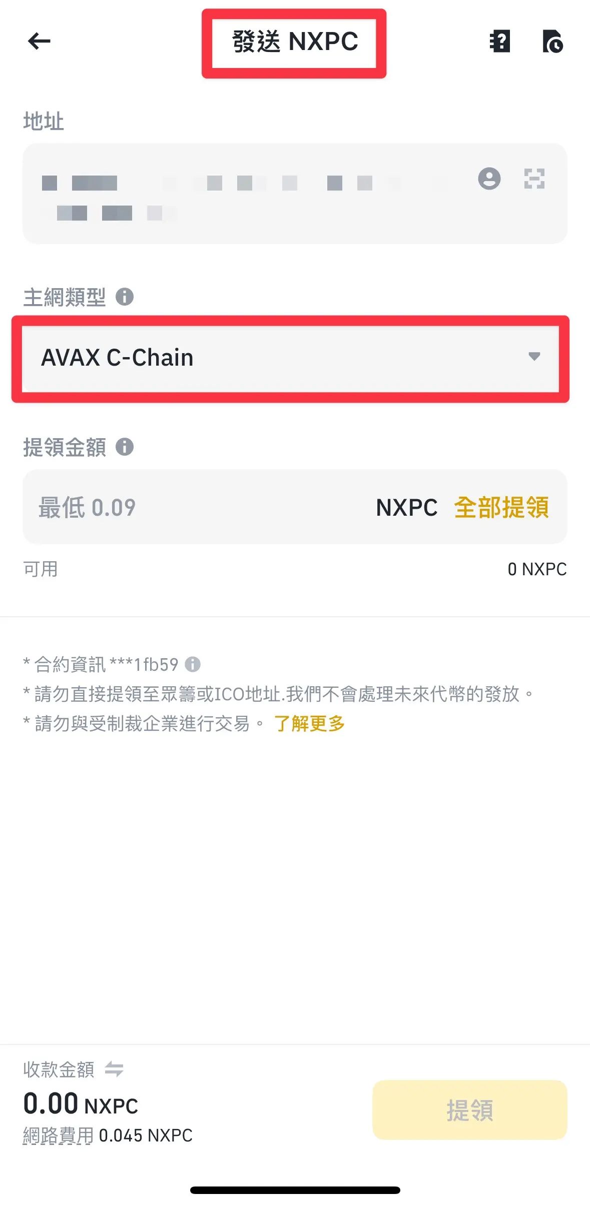 - 将交易所的 NXPC 和 AVAX 提领到 MetaMask 个人钱包地址,提币网路选择Avalanche C-Chain