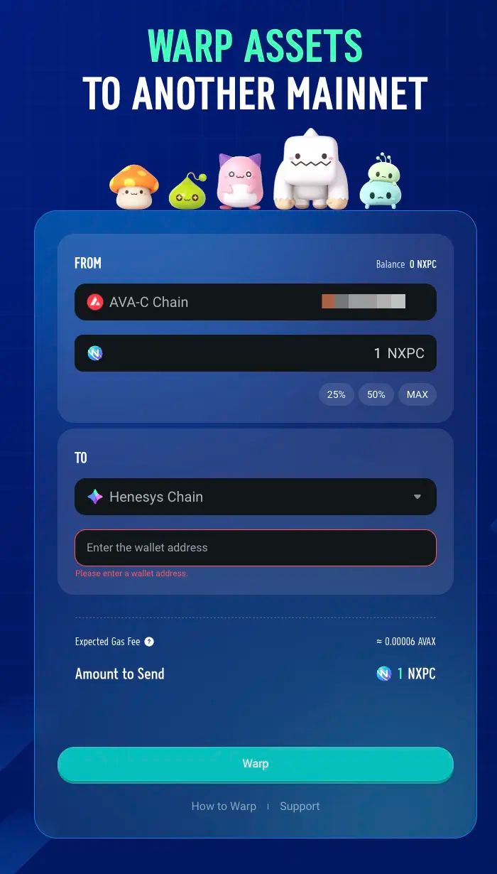 - 在官方 WARP 页面将 NXPC 从 Avalanche C-Chain 跨至 Henesys Chain