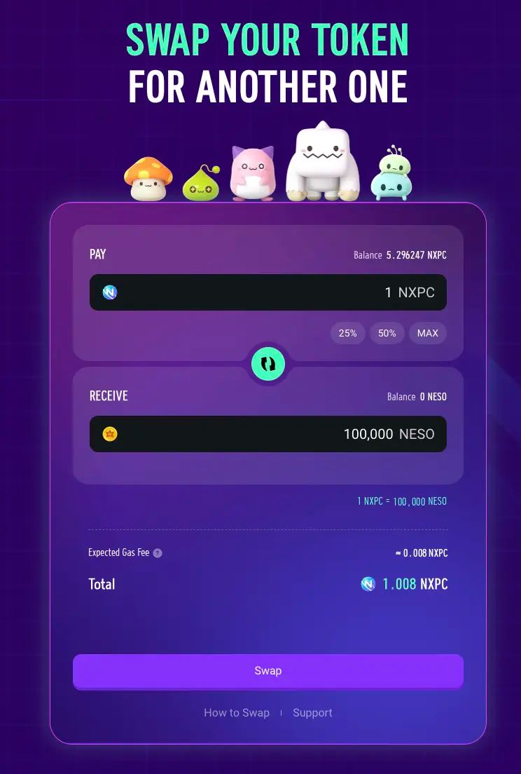 - 在官方 SWAP 页面将 NXPC 兑换为 NESO(目前汇率 1:100000)