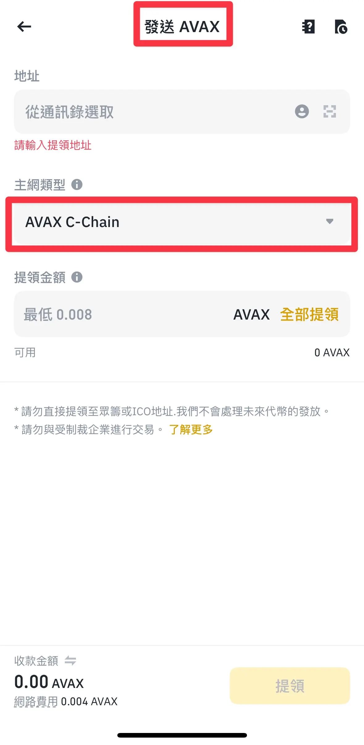 - ⚠️切记:网路一定要选 Avalanche C-Chain,否则币可能无法正确到帐甚至遗失!