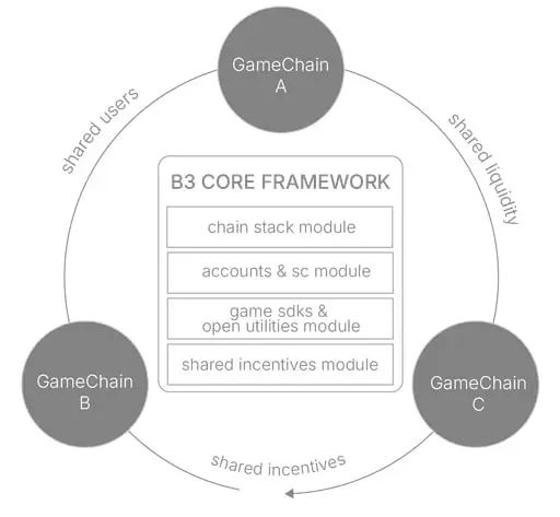 B3 构建了一个针对游戏优化的私有第 3 层(L3)链,驻留在 Base 上以继承速度和低廉的交易成本。开发人员可以在这个 L3 上部署GameChains(用于游戏的独立应用链),控制游戏逻辑,同时保持互操作性和用户/流动性共享。