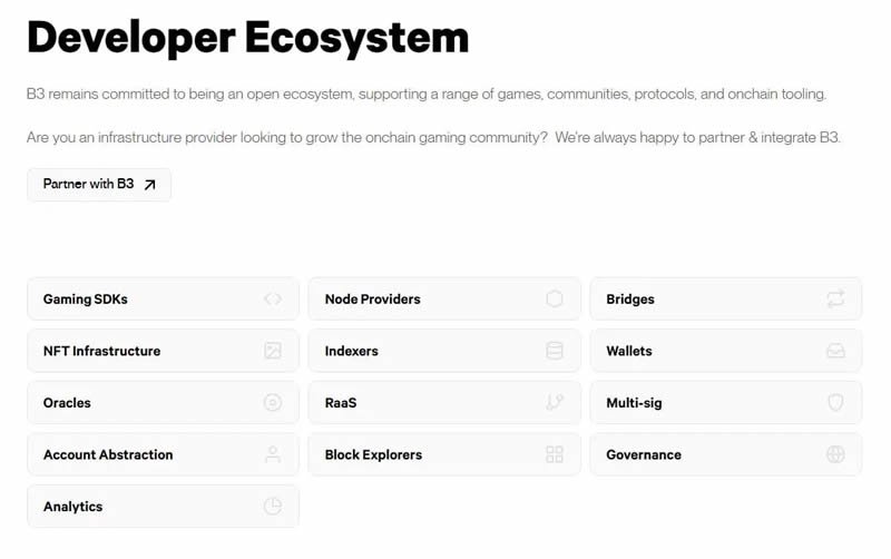 - B3 与 Immutable 或 Ronin 有何不同?→ B3 通过 Sprinter 和 GameChain 支持所有链上的所有游戏 - 而不仅限于 Immutable 或 Ronin 等特定链。