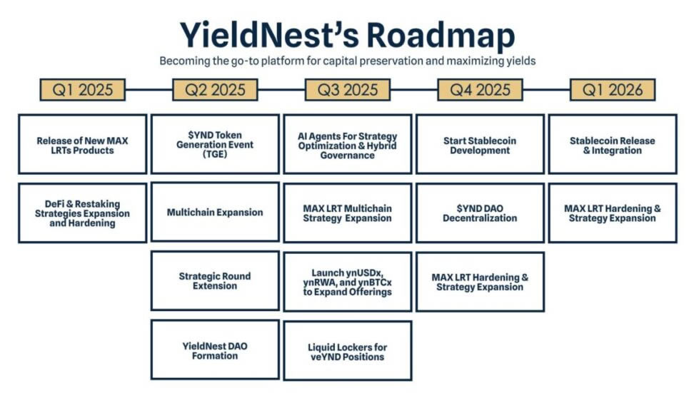 YieldNest的路线图专注于四个主要发展阶段,最终实现完全自主和生态系统的复杂性。 2025年第一季度重点集中于扩展MAX LRT及增强再质押策略,第二季度将迎来YND TGE、多链扩展和正规DAO的建立。
