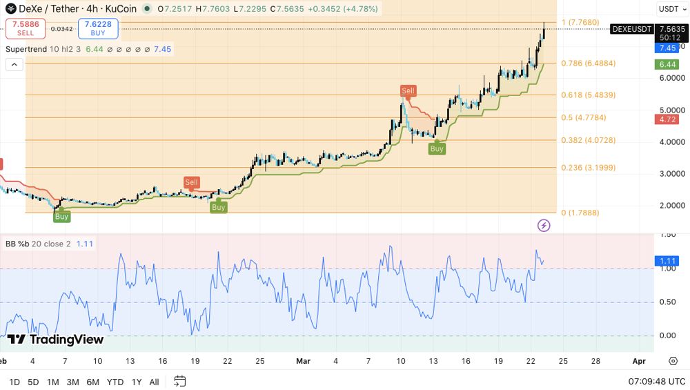 DEXE 指数稳居其超级趋势指标上方,确认了多头持续占据主导地位。此外,超级趋势线在 6.4 美元附近起到了动态支撑作用。