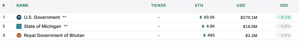 - 美国政府:约 60000 枚 ETH,价值约 2.7 亿美元