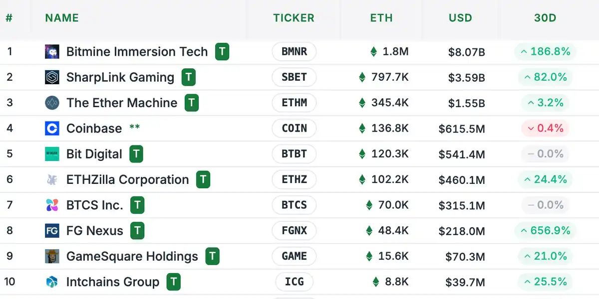 - The Ether Machine:34.5 万枚,30 日内变动+3.2% 其他如 ETHZilla、FG Nexus 等也在逐步加码。