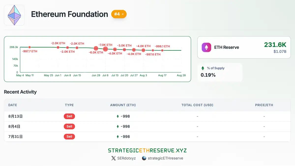 目前,以太坊基金会持有约 23.16 万枚 ETH,占总供给约 0.19%。虽然规模不算庞大,但这部分资金是长期战略性储备。基金会一般会定期抛售少量 ETH,用来支持研发、社区拨款与运营,基本属于「健康的卖压」。