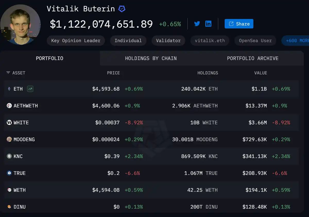 根据 Arkham 数据,V 神个人持有约 24 万枚 ETH,占比约 0.2%。在 ETH 的 1.2 亿枚总量里,这个比例并不高,但 V 神持仓的意义,更多在于「信号作用」: 他卖币,市场会揣摩是否为捐赠,还是单纯减持。他囤币,代表对 ETH 长期价值的信心。