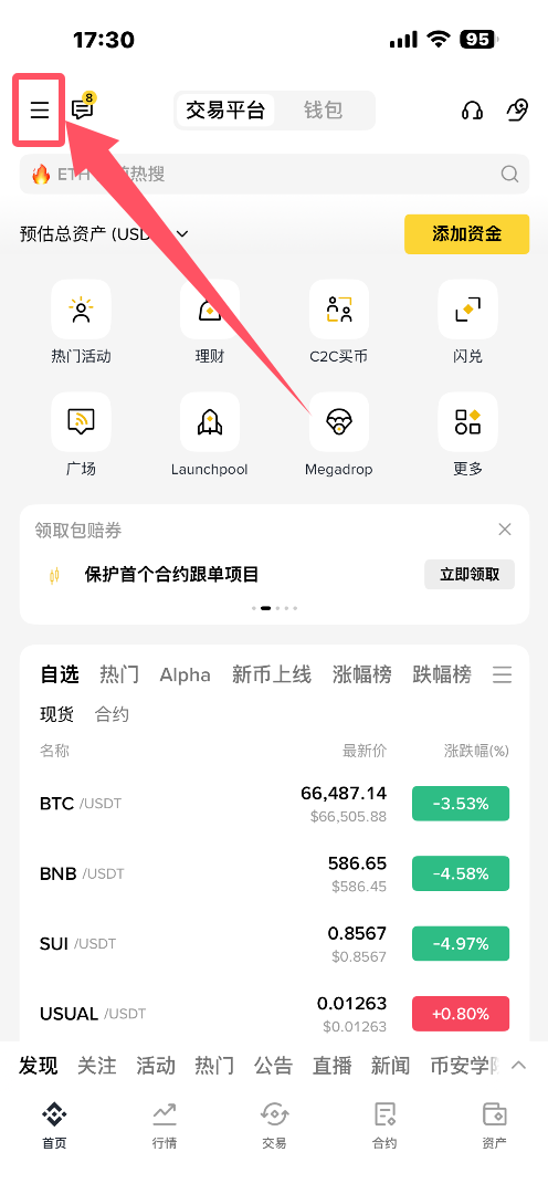 打开币安APP,在左上角点击三个横。
