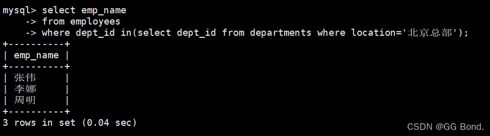 SELECT emp_name FROM employees WHERE dept_id IN (SELECT dept_id FROM departments WHERE location = '北京总部');