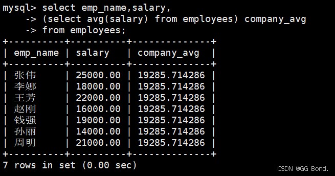SELECT emp_name, salary, (SELECT AVG(salary) FROM employees) as company_avg FROM employees;
