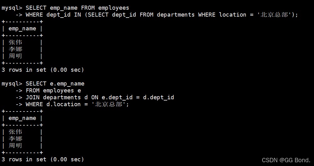 -- 不推荐 SELECT emp_name FROM employees WHERE dept_id IN (SELECT dept_id FROM departments WHERE location = '北京总部'); -- 推荐 SELECT e.emp_name FROM employees e JOIN departments d ON e.dept_id = d.dept_id WHERE d.location = '北京总部';