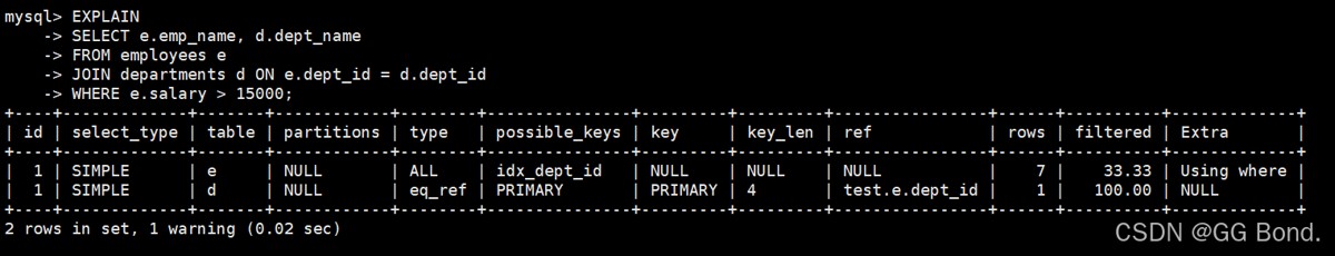 EXPLAIN SELECT e.emp_name, d.dept_name FROM employees e JOIN departments d ON e.dept_id = d.dept_id WHERE e.salary > 15000;