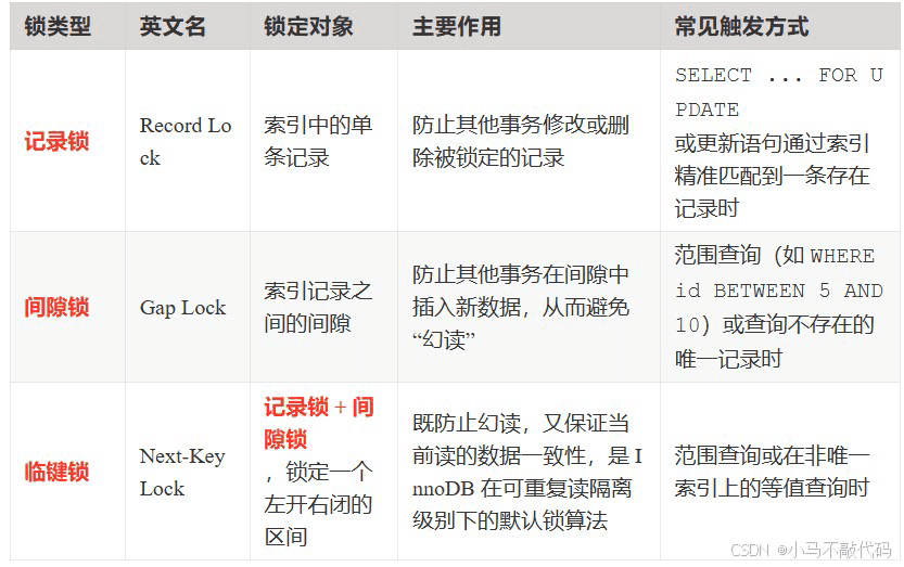 下面这张表格汇总了行级锁的主要类型和核心特点,可以帮助你快速建立整体印象。