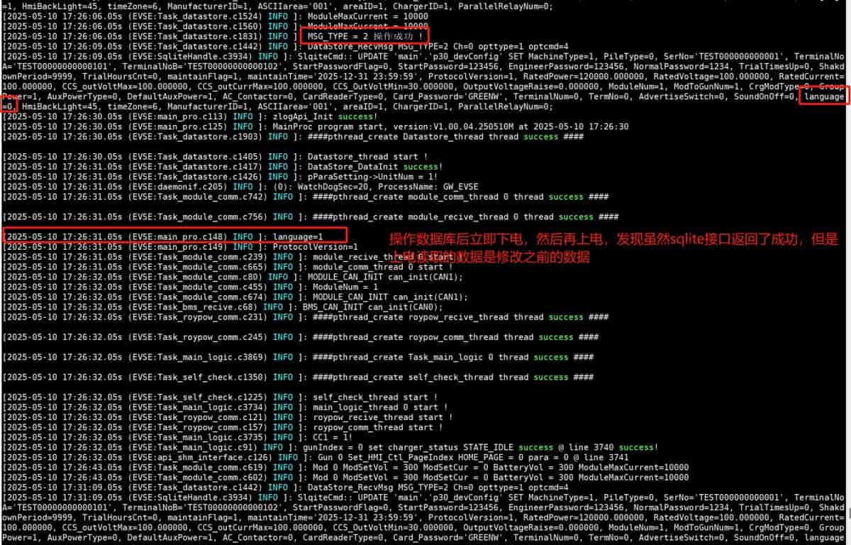 在嵌入式设备中使用Sqlite保存数据,由于设备未做掉电处理,在保存数据后,立即下电,会导致数据未能保存到数据库文件中。如下图所示:上电验证数据库读出的数据和设定值不一致,数据未能保存成功。