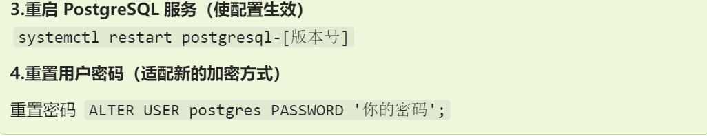 #修改配置文件 vim /var/lib/pgsql/14/data/postgresql.conf #将监听地址修改为# -----60行------- listen_address='*' #默认listen_address配置是注释掉的,所以也可以直接在配置文件开头加入该行 允许所有IP访问 #修改配置文件 vim /var/lib/pgsql/14/daata/pg_hba.conf -----IPv4 local connections 行---------- host all all 0.0.0.0/0 md5 #重启postgresql服务 systemctl restart postgresql-14