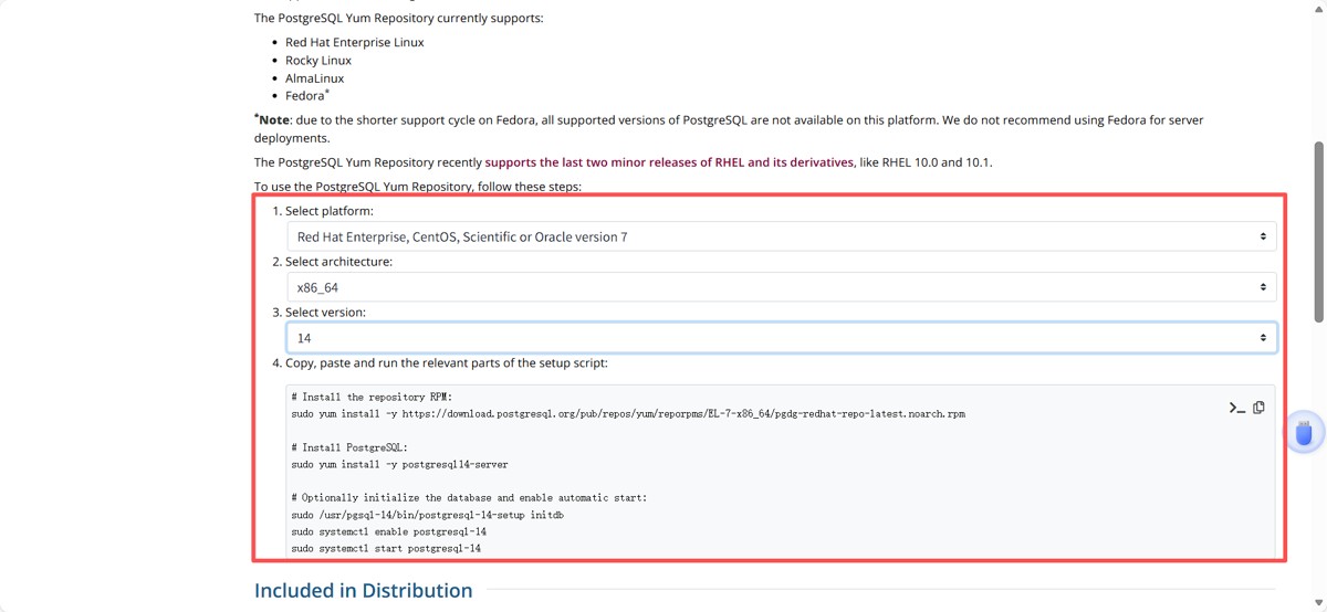 选择好自己的系统,版本号以及你所想下载的postgresql版本号,就可以直接获取社区yum下载命令,直接复制至自己的虚拟机内即可下载。