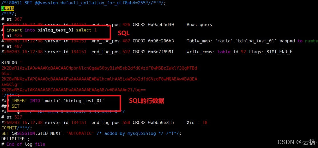# 进入Binlog目录 cd /data/mysql/binlog/ # 解析命令:--start-position=起始位点 --stop-position=结束位点(可选) mysqlbinlog --start-position=212 --stop-position=763 mysql-bin.000006 -vv > /data/binlog_parse_01.sql
