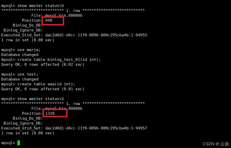 # 查看当前位点 show master status\G -- 切换到maria库创建表 use maria; create table binlog_test_01(id int); -- 切换到test库创建表 use test; create table aaa(id int); -- 记录位点范围(起始:948,结束:1339) show master status\G