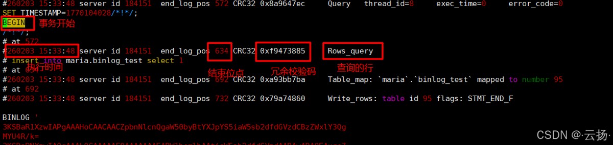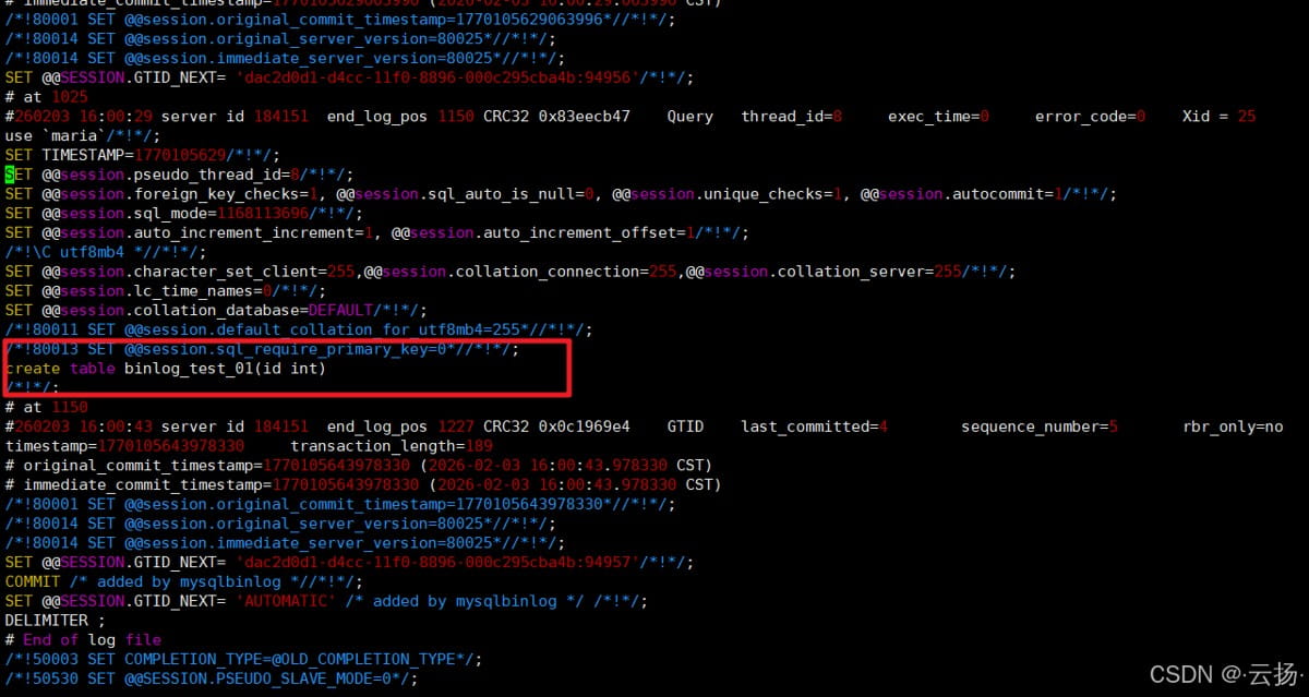 # 解析指定时间后的数据(格式:YYYY-MM-DD HH:MM:SS) mysqlbinlog --start-datetime="2026-02-03 15:29:55" mysql-bin.000006 > /data/binlog_parse_02.sql # 解析时间区间内的数据(添加--stop-datetime) mysqlbinlog --start-datetime="2026-02-03 15:29:55" --stop-datetime="2026-02-03 15:33:48" mysql-bin.000006 > /data/binlog_parse_02_1.sql