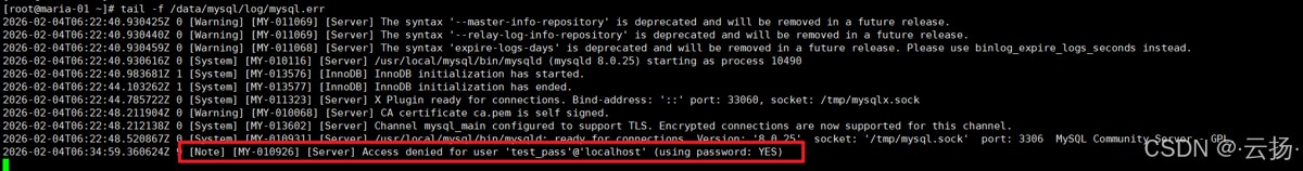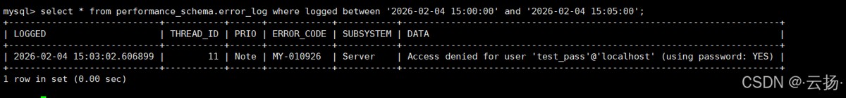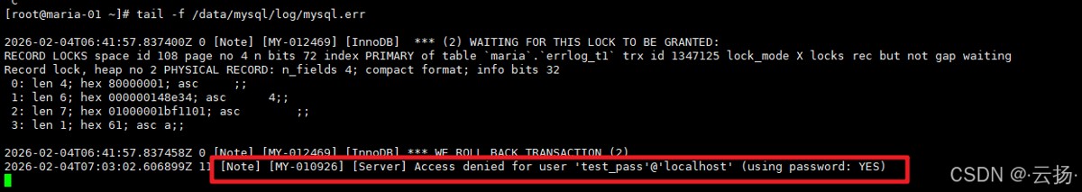 日志将显示:[Note] [MY-010926] [Server] Access denied for user 'test_pass'@'localhost' (using password: YES)