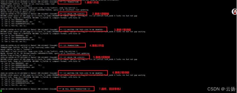 日志将详细展示两个事务的TRANSACTION信息及锁等待关系(如WAITING FOR THIS LOCK TO BE GRANTED)。