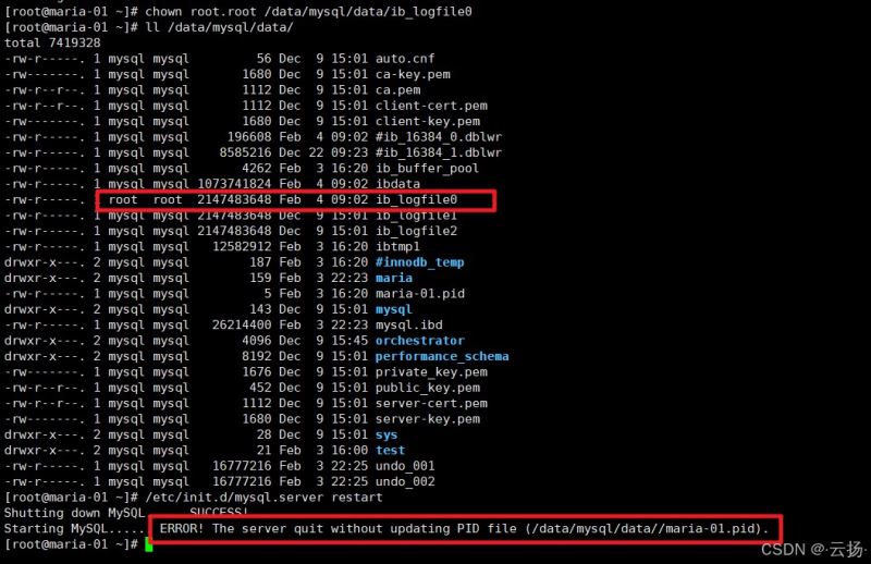 # 修改ib_logfile0文件属主为root(高危操作,测试环境专用) chown root.root /data/mysql/data/ib_logfile0 # 尝试启动MySQL,此时会启动失败 /etc/init.d/mysql.server restart