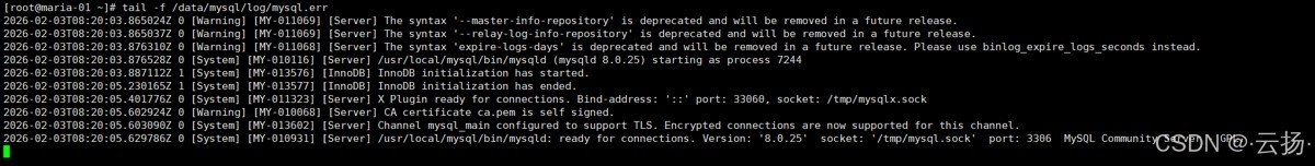 # 查看最后50行日志(定位最新错误) tail -n 50 /data/mysql/log/mysql.err # 实时跟踪日志(监控服务运行状态) tail -f /data/mysql/log/mysql.err