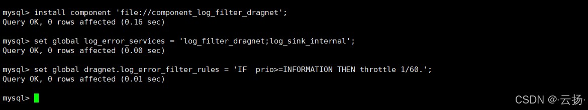 # 设置过滤规则:信息类日志每分钟不超过 1 条 SET GLOBAL dragnet.log_error_filter_rules = 'IF prio>=INFORMATION THEN throttle 1/60.';