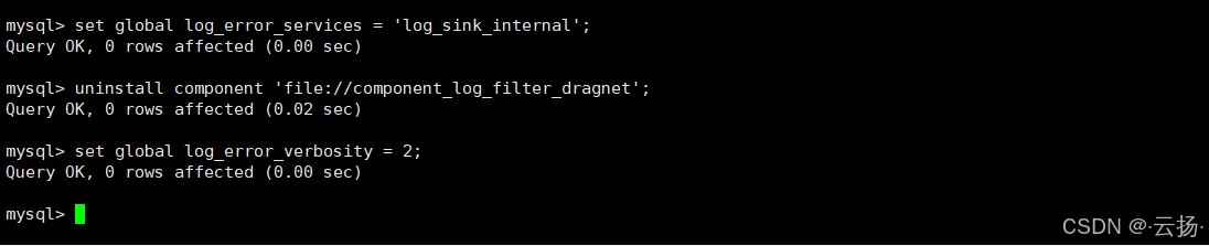 -- 1. 恢复日志服务:直接输出,不经过滤 SET GLOBAL log_error_services = 'log_sink_internal'; -- 2. 卸载dragnet组件 UNINSTALL COMPONENT 'file://component_log_filter_dragnet'; -- 3. 恢复默认日志级别 set global log_error_verbosity = 2;