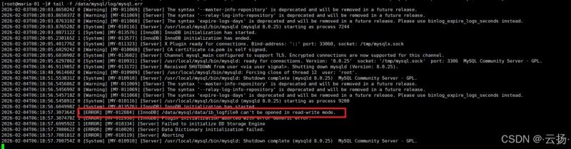 日志将显示明确错误:[ERROR] [MY-012884] [InnoDB] /data/mysql/data/ib_logfile0 can't be opened in read-write mode.(文件无法以读写模式打开)