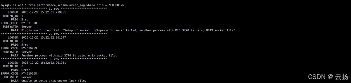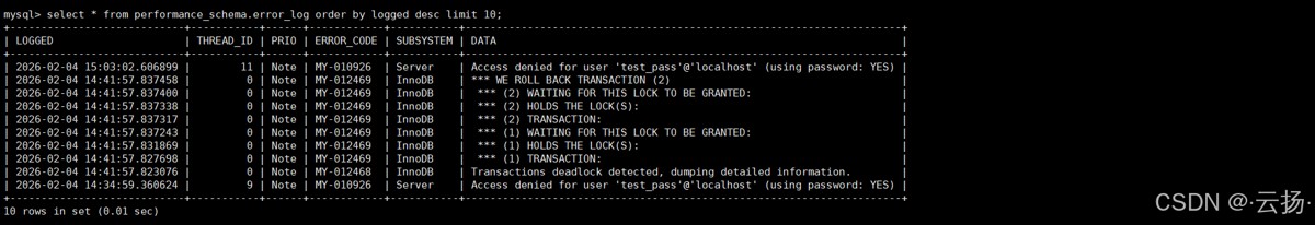 -- 查看最新10条错误日志 select * from performance_schema.error_log order by LOGGED desc limit 10; -- 查看所有ERROR级别的日志(格式化输出) select * from performance_schema.error_log where PRIO = 'ERROR'\G; -- 查询指定时间范围的日志 select * from performance_schema.error_log where LOGGED between '2026-02-04 15:00:00' and '2026-02-04 15:05:00';