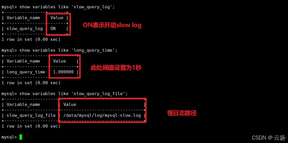 -- 查看慢查询日志启用状态(ON/OFF) show variables like 'slow_query_log'; -- 查看慢查询阈值(单位:秒,默认10秒) show variables like 'long_query_time'; -- 查看慢查询日志存储路径 show variables like 'slow_query_log_file';