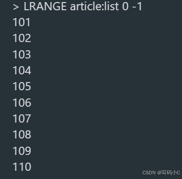 # 从右侧插入(保证新数据在列表头部/尾部,根据业务调整) RPUSH article:list 101 102 103 104 105 106 107 108 109 110