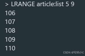 LRANGE article:list 5 9 # 返回 [106, 107, 108, 109, 110]