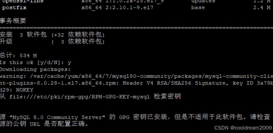 MySQL 官方在 2022 年更新了 RPM 仓库签名密钥。如果系统仍使用旧版本密钥,那么新包的签名自然无法通过验证,安装会被安全机制拦截。