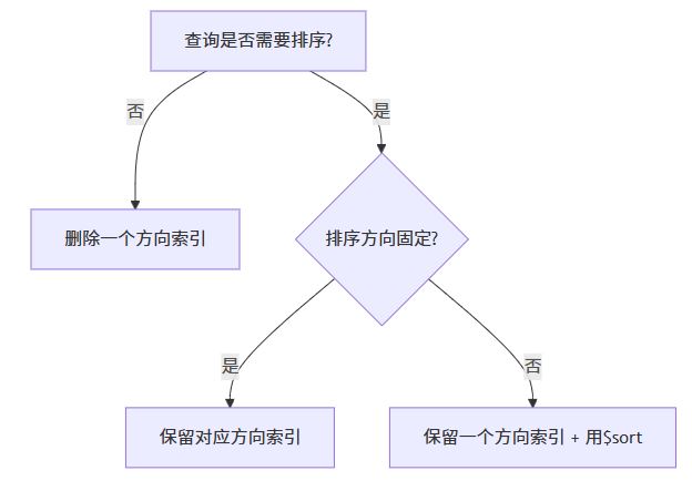 | 反向排序冗余 | explain() 检查排序方向 | 保留一个方向索引 |