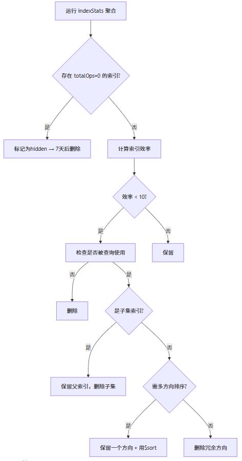 | 僵尸索引 | $indexStats + accesses.ops=0 | hideIndex → 7天后dropIndex |