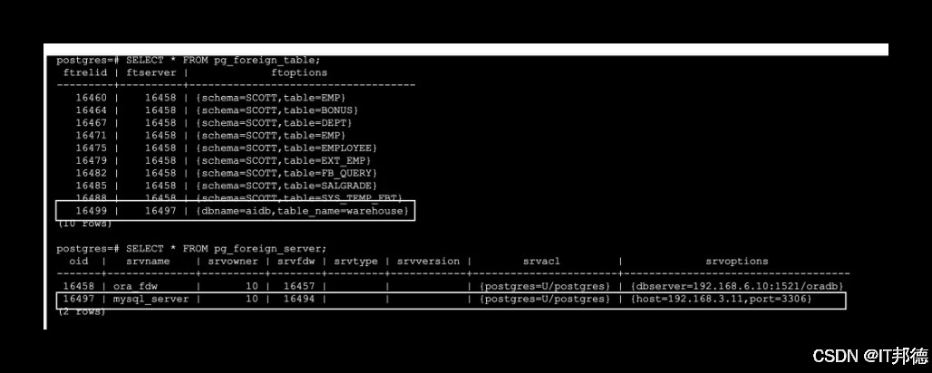 查看所有外部表的定义 SELECT * FROM pg_foreign_table; 以标准 SQL 视角查看外部表 SELECT * FROM information_schema.foreign_tables; 查看 mysql_fdw 服务器的连接配置 SELECT * FROM pg_foreign_server; 查看连接到 MySQL 所用的用户名映射 SELECT * FROM pg_user_mappings;